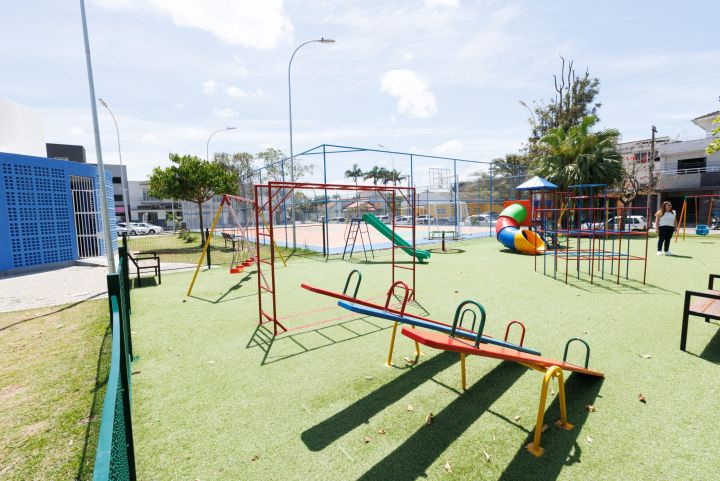 O projeto incluiu a reforma dos banheiros, pintura da quadra esportiva, instalação de cercamento no parquinho, drenagem, implantação de piso drenante e grama sintética, além da substituição e atualização dos brinquedos.